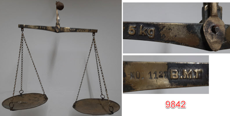 9842: Marktwaage ‘B.M.T’, Handwaage, mit 2 Messingbecken, bis 5 kg.