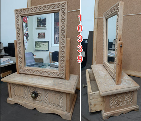 Schminkspiegel (fehlerfrei) mit Schublade für Tischauflage, Spiegel schwenkbar, Tanne, Natur, aufwändige Schnitzereien, dekorativ.